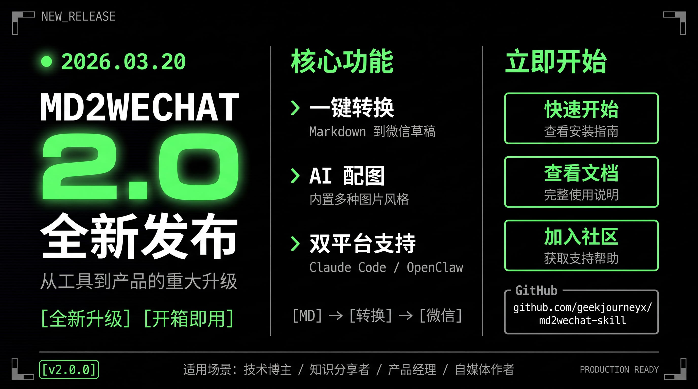Why md2wechat-skill 2.0 is more than a small update, and what actually changed across the CLI contract, prompt catalog, image workflow, dual skill paths, installers, and documentation.