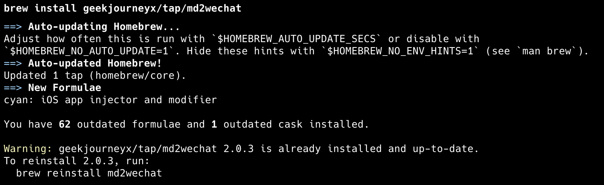 brew install geekjourneyx/tap/md2wechatScreenshot: Install md2wechat CLI