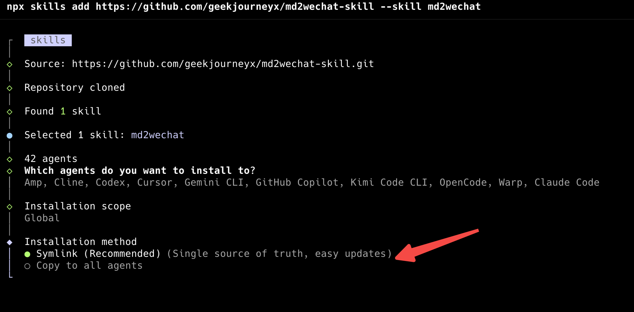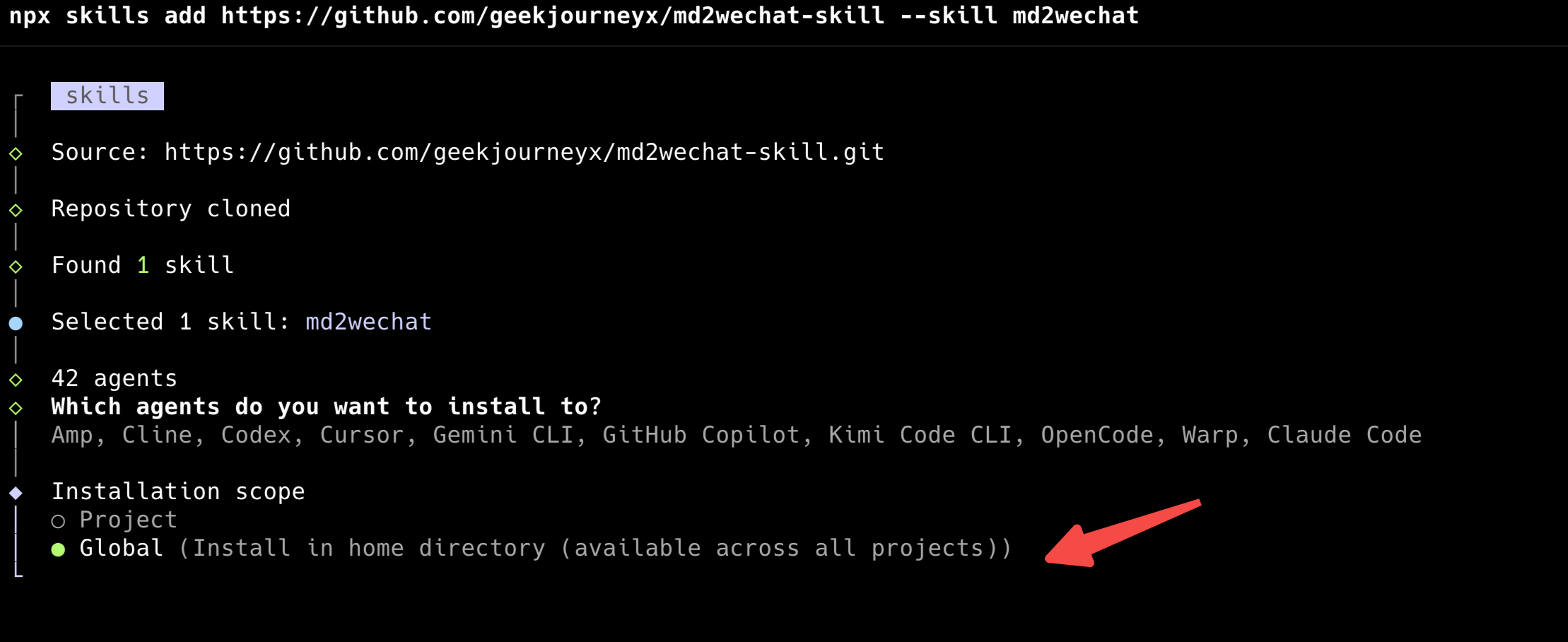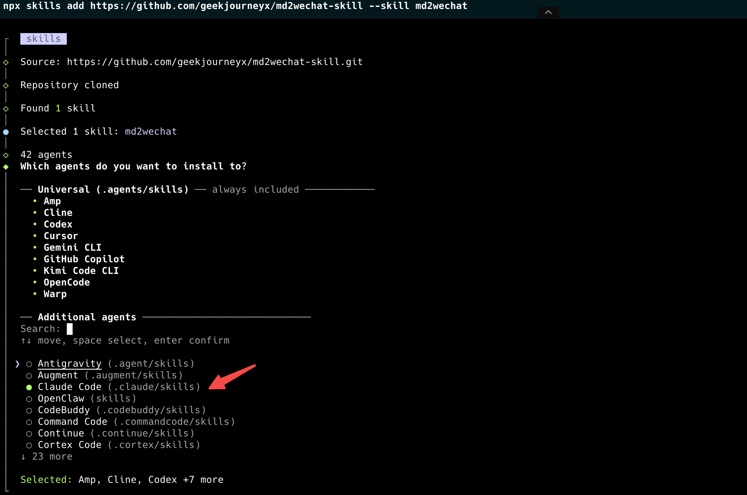 npx skills add https://github.com/geekjourneyx/md2wechat-skill --skill md2wechatOne detail matters here: